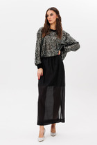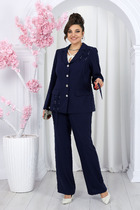 Комплект с шортами выполднен из трикотажного полотна серого цвета. Джемпер прямого широкого кроя, V-образный срез горловины, застежка центральная на петли пуговички, рукав втачной слегка спущен, по низу нашито декоративное кружево. Длина изделия по спинке 56 см, длина рукава от горловины 75 см. Шорты свободного кроя. Пояс на резинке. По передней части имитация застежки на 3 пуговицы. По низу нашито декоративное кружево. Длина 36 см.