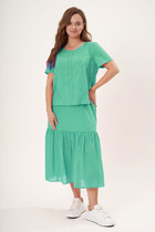 Костюм 2-предметный. Состоит из жакета и юбки.   Жакет 2-бортный, на подкладке. Рукав длиннный, втачной, одношовный, по окату собран складками дляя увеления объёма. Обработаны талиевые вытачки по переду и спинке изделия.  Юбка в длине мини. Пояс притчой, п спинке обработан резинкой для лучшего прилегания. Низ юбки отрезной, собран в мелкую складку