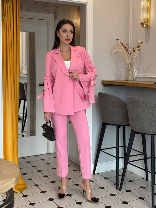 Костюм 2-хпредметный.  Жакет  однобортный свободнго силуэта. Жакет обработан подкладкой. Рукав прямой, длинный, втачной, отрезной с пришитой присборенной деталью, шнурком из основной ткани для завязывания.  Брюки прямого кроя, длинна 7/8, застёжка- гульфик , по боковым швам обработаны карманы