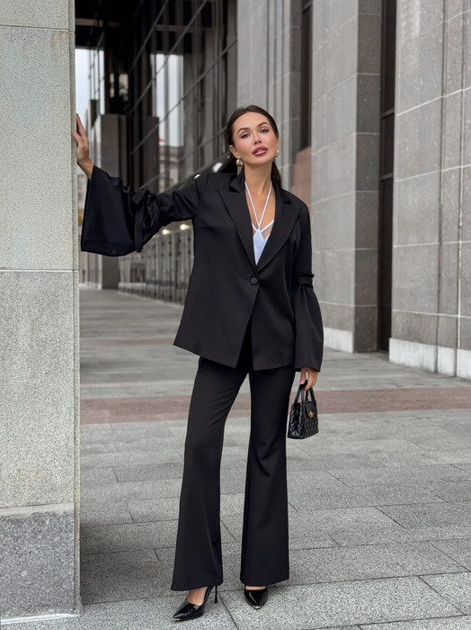 Жакет  однобортный свободнго силуэта. Жакет обработан подкладкой. Рукав прямой, длинный, втачной, отрезной с пришитой присборенной деталью, шнурком из основной ткани для завязывания. Брюки классические, по форме прямые, клешенные от лиии колена, застежка - потайная молния. Съёмный пояс из основной ткани, обработан пряжкой - в комплекте