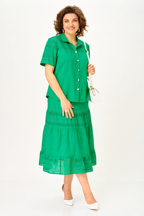 Комплект женский, состоящий из блузки и юбки, комбинированные из хлопковой однотонной ткани и ткани с вышивкой в тон. Блузка прямого силуэта с рубашечным воротником и планкой с пуговицами, рукав короткий с манжетой по низу, по переду и спинке кокетки, низ изделия фигурный. Юбка расширенная к низу, на подкладке из х/б ткани однотонной, с воланами, по поясу эластичная тесьма.