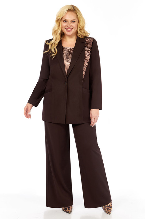 Нарядный женский трёхпредметный комплект состоит из свободного жакета и широких брюк,выполненных из однотонной плательно-костюмной ткани и нарядной блузы из блузочной блестящей ткани.
