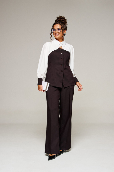 Костюм женский 2-ух предметный: жакет, имитирующий блузку в верхней части, и брюки в романтическом стиле. Выполнен из костюмного полотна с нежной фактурой в контрастном сочетании цвета с мягкой вискозной блузочной тканью.