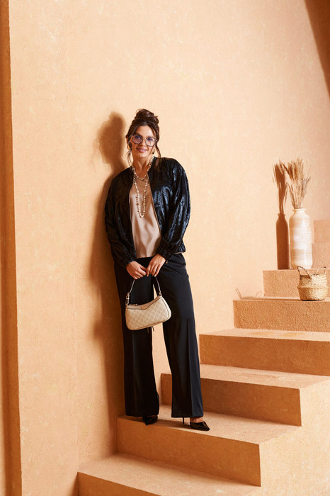 Брючный комплект в комбинации сияющего роскошного атласа с эксклюзивным ворсовым шифоном не останется незаметным!