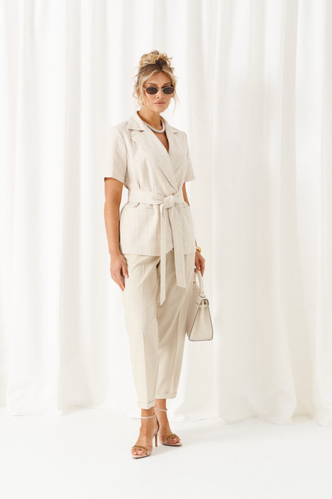 Эффектный комплект состоит из жакета и брюк, выполнен из мягкой смесовой ткани с органическими льном и вискозой, практичен в носке.