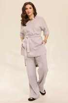 Комплект женский-двойка, из текстильной ткани, жакет удлиненный, полуприлегающего силуэта с центральной бортовой застежкой на пуговицы до линии перегиба лацкана. Спереди рельефные швы от плечевого шва, отрезной бочок и карман с клапаном. Спинка с рельефами от плечевого шва. Рукав втачной, двухшовный. Воротник пиджачного типа. Жакет на подкладке, длина по спинке 67 см, длина рукава 62 см. Брюки прямые,классические, с заутюженными стрелками,по переду обработаны карманы с отрезным бочком,застежка на тесьму-молнию и 1 пуговицу.На задних половинках обработаны вытачки и имитация карманов с листочкой, пояс в брюках притачной. Длина брюк от талии по боковому шву 100 см.