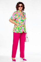 Комплект женский, 2-х предметный, состоит из жакета и и брюк. Жакет женский удлиненный, из текстильной ткани, на подкладке, полуприлегающего силуэта с центральной бортовой застежкой на пуговицы до линии перегиба лацкана. Спереди рельефные швы от плечевого шва, отрезной бочок и карман с клапаном. Спинка с рельефами от плечевого шва. Рукав втачной, двухшовный, по низу рукава обработана шлица на петли-пуговицы. Воротник пиджачного типа. Длина по спинке 66 см, длина рукава 62 см.Брюки прямые,классические, с заутюженными стрелками,по переду обработаны карманы с отрезным бочком,застежка на тесьму-молнию и 1 пуговицу.На задних половинках обработаны вытачки и имитация карманов с листочкой, пояс в брюках притачной. Длина брюк от талии по боковому шву 100 см.