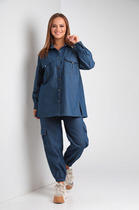 Комплект 2-х предметный из хлопковой ткани, состоит из жакета и и брюк. Жакет женский удлиненный, полуприлегающего силуэта с центральной бортовой застежкой на пуговицы до линии перегиба лацкана. Спереди рельефные швы от плечевого шва, отрезной бочок и карман с клапаном. Спинка с рельефами от плечевого шва. Рукав втачной, двухшовный, 3/4, с небольшим разрезом в локтевом шве. Воротник пиджачного типа. Перед жакета на подкладке. Длина рукава 50, длина по спинке 68 см. Классические брюки, прямые, слегка заужены к низу,заутюжены стрелки,по переду обработаны карманы с отрезным бочком,застежка на тесьму-молнию и 1 пуговицу.На задних половинках обработаны вытачки и имитация карманов в рамку с двумя обтачками,пояс в брюках притачной. По низу брюк в боковом шве есть небольшой разрез. Длина брюк от талии по боковому шву 93 см.