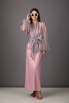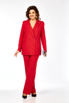Комплект женский-двойка, из текстильной ткани, жакет удлиненный, полуприлегающего силуэта с центральной бортовой застежкой на пуговицы до линии перегиба лацкана. Спереди рельефные швы от плечевого шва, отрезной бочок и карман с клапаном. Спинка с рельефами от плечевого шва. Рукав втачной, двухшовный. Воротник пиджачного типа. Жакет на подкладке, длина по спинке 67 см, длина рукава 62 см. Брюки прямые, классические, с заутюженными стрелками, по переду обработаны карманы с отрезным бочком, застежка на тесьму-молнию и 1 пуговицу. На задних половинках обработаны вытачки и имитация карманов с листочкой, пояс в брюках притачной, по боковому на резинке.  Длина брюк от талии по боковому шву 103 см.