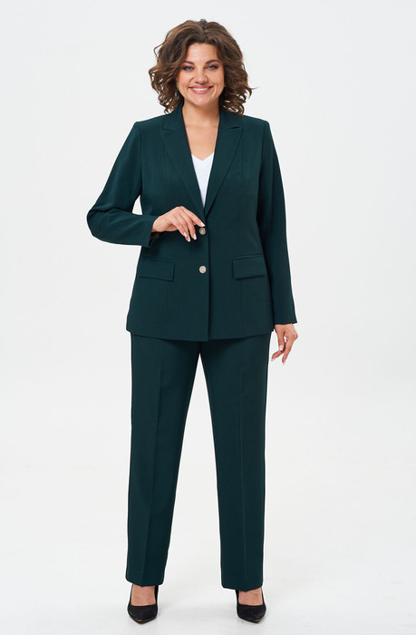 Комплект женский-двойка, из текстильной ткани, жакет удлиненный, полуприлегающего силуэта с центральной бортовой застежкой на пуговицы до линии перегиба лацкана. Спереди рельефные швы от плечевого шва, отрезной бочок и карман с клапаном. Спинка с рельефами от плечевого шва. Рукав втачной, двухшовный. Воротник пиджачного типа. Жакет на подкладке, длина по спинке 67 см, длина рукава 62 см. Брюки прямые, классические, с заутюженными стрелками, по переду обработаны карманы с отрезным бочком, застежка на тесьму-молнию и 1 пуговицу. На задних половинках обработаны вытачки и имитация карманов с листочкой, пояс в брюках притачной, по боковым швам резинка. Длина брюк от талии по боковому шву 103 см.
