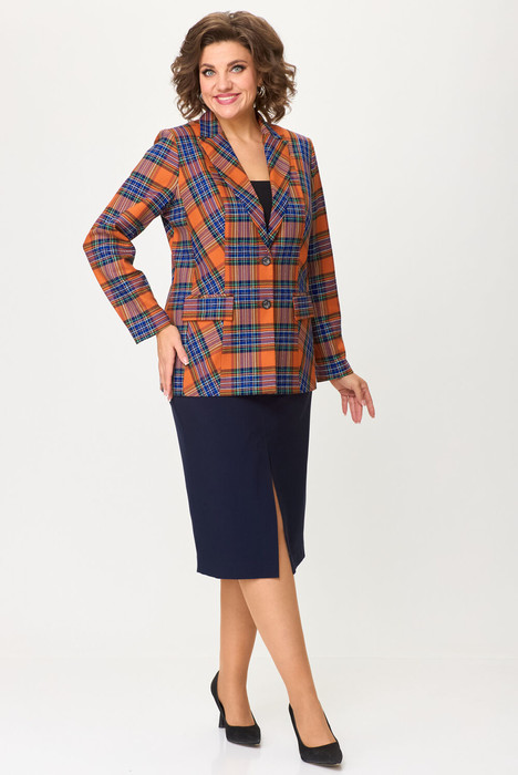 Комплект женский-двойка, из текстильной ткани, жакет удлиненный, полуприлегающего силуэта с центральной бортовой застежкой на пуговицы до линии перегиба лацкана. Спереди рельефные швы от плечевого шва, отрезной бочок и карман с клапаном. Спинка с рельефами от плечевого шва. Рукав втачной, двухшовный. Воротник пиджачного типа. Жакет на подкладке, длина по спинке 67 см, длина рукава 62 см.Юбка прямого силуэта, с небольшой кокеткой в верхней части, которая обработана обтачкой, спереди обработан разрез-шлица. Заднее полотнище со средним швом и талиевыми вытачками, застегивается на потайную молнию. Длина по боковому шву 74 см. Юбка на подкладке.