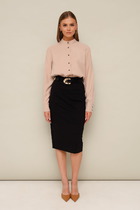 Комплект женский-двойка,из костюмной ткани, жакет удлиненный, свободного силуэта с центральной бортовой застежкой на пуговицы до линии перегиба лацкана. По переду имеется отрезной бочок и вертикальные вытачки. С прорезными карманами с клапаном и двумя обтачками. Спинка цельная. Воротник пиджачного типа. Рукав двухшовный, втачной. Жакет на подкладке. Длина рукава 63 см, длина по спинке 75 см. Брюки прямые, классические, из текстильной ткани, с заутюженными стрелками, по переду обработаны карманы с отрезным бочком, застежка на тесьму-молнию и 1 пуговицу. На задних половинках обработаны вытачки и имитация карманов с листочкой, пояс в брюках притачной. Длина брюк от талии по боковому шву 103 см.