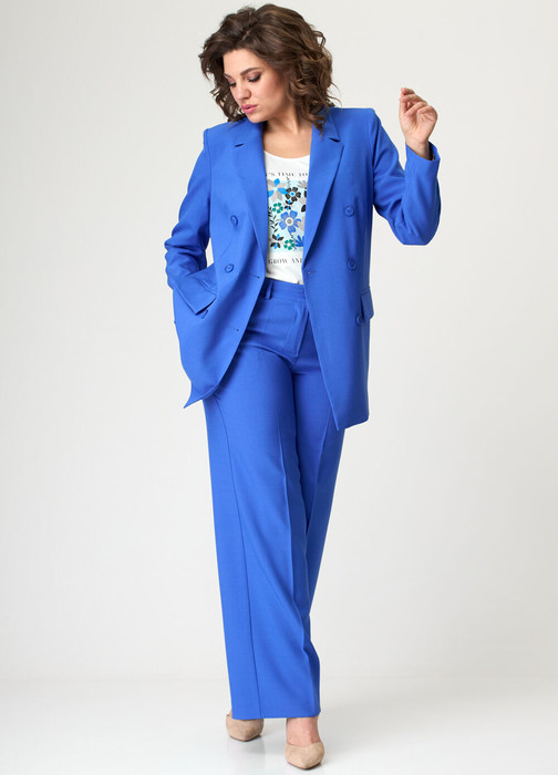 Комплект 2-х предметный состоит из жакета и и брюк. Жакет женский удлиненный, из текстильной ткани, на подкладке, полуприлегающего силуэта с центральной бортовой застежкой на пуговицы до линии перегиба лацкана. Спереди рельефные швы от плечевого шва, отрезной бочок и карман с клапаном. Спинка с рельефами от плечевого шва. Рукав втачной, двухшовный. Воротник пиджачного типа. Длина по спинке 74 см, длина рукава 62 см. Брюки классические, прямые, слегка заужены к низу,заутюжены стрелки, по переду обработаны карманы с отрезным бочком, застежка на тесьму-молнию и 1 пуговицу. На задних половинках обработаны вытачки и имитация карманов с листочкой, пояс в брюках притачной. Длина брюк от талии по боковому шву 103 см.