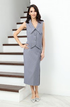 Комплект 2-х предметный состоит из жакета и и брюк. Жакет женский удлиненный, из текстильной ткани, полуприлегающего силуэта с центральной бортовой застежкой на пуговицы до линии перегиба лацкана. По переду имеется отрезной бочок и вертикальные вытачки. С прорезными карманами с клапаном и двумя обтачками. Спинка со средним швом. Воротник пиджачного типа. Рукав двухшовный, втачной. Длина рукава 63 см, длина по спинке 80 см. Брюки-палаццо из текстильной ткани. В брюках выполнены карманы с отрезным бочком в боковом шве, одна складка в районе пояса. Пояс притачной, с отделочным удлиненным поясом из текстильной ткани. Застёжка на молнию. По задним половинкам обработаны вытачки. Длина по боковому шву 105 см.