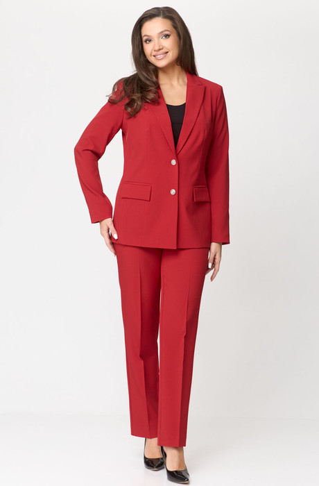 Комплект женский, 2-х предметный, состоит из жакета и и брюк. Жакет женский удлиненный, из текстильной ткани, на подкладке, полуприлегающего силуэта с центральной бортовой застежкой на пуговицы до линии перегиба лацкана. Спереди рельефные швы от плечевого шва, отрезной бочок и карман с клапаном. Спинка с рельефами от плечевого шва. Рукав втачной, двухшовный, по низу рукава обработана шлица на петли-пуговицы. Воротник пиджачного типа. Длина по спинке 66 см, длина рукава 62 см.Брюки прямые,классические, с заутюженными стрелками,по переду обработаны карманы с отрезным бочком,застежка на тесьму-молнию и 1 пуговицу.На задних половинках обработаны вытачки и имитация карманов с листочкой, пояс в брюках притачной. Длина брюк от талии по боковому шву 105 см.