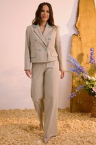 Комплект женский, 2-х предметный, состоит из жакета и и брюк. Жакет женский удлиненный, из текстильной ткани, на подкладке, полуприлегающего силуэта с центральной бортовой застежкой на пуговицы до линии перегиба лацкана. Спереди рельефные швы от плечевого шва, отрезной бочок и карман с клапаном. Спинка с рельефами от плечевого шва. Рукав втачной, двухшовный, по низу рукава обработана шлица на петли-пуговицы. Воротник пиджачного типа. Длина по спинке 66 см, длина рукава 62 см.Брюки прямые,классические, с заутюженными стрелками,по переду обработаны карманы с отрезным бочком,застежка на тесьму-молнию и 1 пуговицу.На задних половинках обработаны вытачки и имитация карманов с листочкой, пояс в брюках притачной. Длина брюк от талии по боковому шву 103 см.