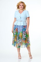 Комплект женский двухпредметный состоит из блузки и брюк. Блузка нарядная выполнена из блузочной ткани контрастных цветов свободного силуэта. Вырез горловины V-образный с воротником на стойке, рукав 3/4 с притачным манжетом, низ на кулиске затягивается на шнурок. Полочка по центру украшена кружевом. Длина блузки по спинке 70 см, длина рукава 52 см. Брюки классические с высокой посадкой, полуприлегающего силуэта, выполнены из плотной костюмной ткани с добавлением эластана. Пояс без резинки, с застежкой молнией на пуговицу. В боковых швах карманы с листочкой. Длина брюк 103 см.