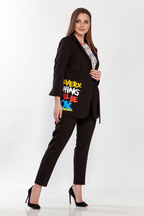 Комплект женский двухпредметный состоит из жакета и брюк. Жакет полуприлегающего силуэта выполнен из костюмной ткани с добавлением эластана на подкладке.  Воротник втачной с отложным лацканом, рукав двухшовный с разрезом, на полочке обработаны функциональные карманы с листочкой. Застегивается на завязки,  длина жакета 75 см, длина рукава 53 см. Брюки классические  с высокой посадкой, полуприлегающего силуэта, выполнены из плотной костюмной ткани с добавлением эластана.  Пояс без резинки, с застежкой молнией на пуговицу. В боковых швах карманы с листочкой. Длина брюк 103 см.