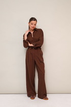 Костюм женский полуприлегающго силуэта, состоит из рубашки и брюк. Выполнен из хлопковой ткани. Рубашка с центрально-бортовой застежкой на петли и пуговицы, воротник на стойке, рукав 3/4 с притачным манжетом, в боковых швах обработаны разрезы и есть накладной карман на полочке. Брюки с высокой посадкой, пояс на резинке, в боковых швах обработаны карманы.
