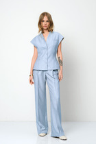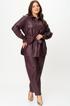 Костюм женский 2-ух предметный, трикотажный. Джемпер с клапанами и манжетами из из экокожи. Застежка на петли ипуговици, по низу с затяжкой. Рукав втачной 3/4. Юбка на подкладке с разрезом в боковом шве. Пояс на резинке.