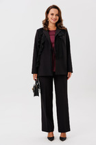 Костюм женский двухпредметный полуприлегающего силуэта, состоит из жакета и брюк. Жакет с декоративным подрезом по переду полочки, рукав втачной 3/4 с разрезом в локтевом шве, без воротника, застежка на крючек, карманы листочки обработаны в подрезе. Брюки на поясе с застежкой молния и пуговица.