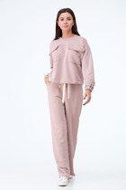 Костюм женский двухпредметный полуприлегающего силуэта, состоит из жакета и брюк. Жакет с декоративным подрезом по переду полочки, рукав втачной 3/4 с разрезом в локтевом шве, без воротника, застежка на крючек, карманы листочки обработаны в подрезе. Брюки на поясе с застежкой молния и пуговица.