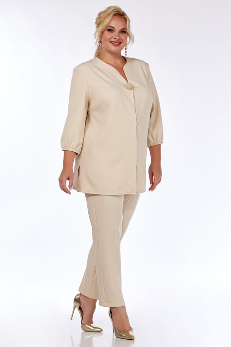 Костюм женский полуприлегающего силуэта, состоит из джемпера и брюк. Джемпер с подрезом по центру переда, с декоративным украшением, рукав втачной 3/4 с резинкой по низу, в боковых швах разрезы. Брюки с застежкой на молнию и пуговицу, в боковых швах карманы.