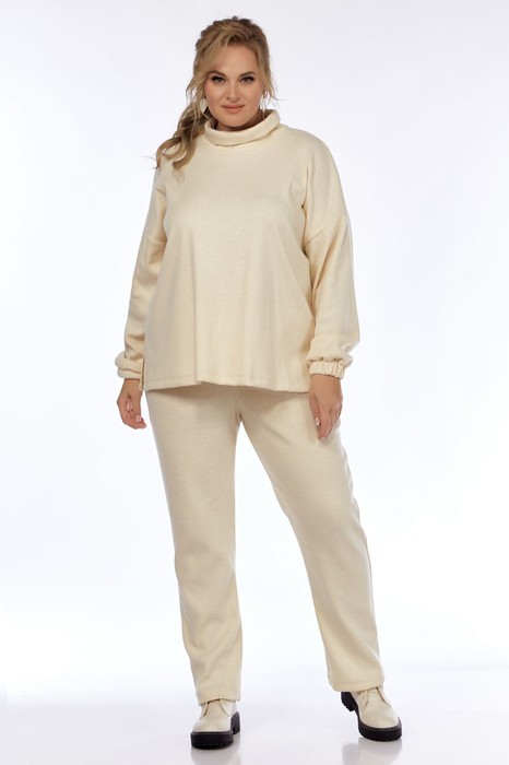 Костюм женский свободного силуэта,состоит из джемпера и брюк. Джемпер с разрезами в боковых швах, рукав длинный  втачной с манжетом на резинке, воротник стойка, Брюки свободные прямые, пояс на резике, в боковых швах карманы.