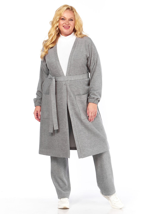 Костюм женский 2-ух предметный.Кардиган длинный ниже колена , на полочке накладные карманы , рукав спущенный с притачным манжетом.Застежка на 1 петлю и пуговицу.Брюки с карманами в боковом шве,пояс на резинке
