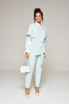 Брюки свободного силуэта, с лампасами по боковому шву. В боковых швах на уровне бедер карманы, верх брюк на поясе с резинок.