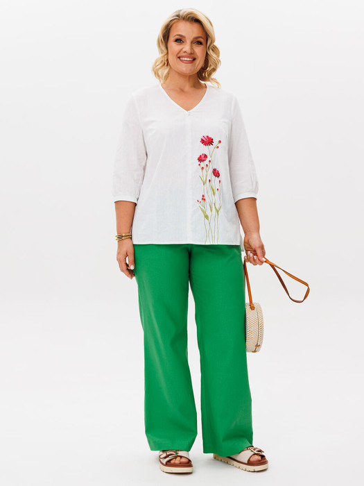 Комплект из мягкой хлопковой блузки и льняных с вискозой брюк- это стильный, удобный образ. Блузка полуприлегающего силуэта. По переду расположена нагрудная вытачка, c V- образным вырезом горловины. Рукав укороченный, со сборкой и манжетой. По переду расположена яркая дизайнерская вышивка. Спинка лаконичная. Льняные брюки свободного кроя. Пояс на резинке, для удобства в носке в пояс вставлен шнурок для регулирования объема по талии. Посадка брюк - высокая. По переду расположены карманы с наклонным входом. По низу широкая подгибка для возможности коррекции по длине. Брюки с хорошей посадкой, в этом заключается их секрет универсальности и возможности носить их девушкам с любым типом фигуры. Идеальные брюки для летней жары, в них ваша кожа будет дышать. Они выполнены из мягкого льна с вискозой. Отличный вариант, как для городского лета, работы, встреч и отдыха на море.
