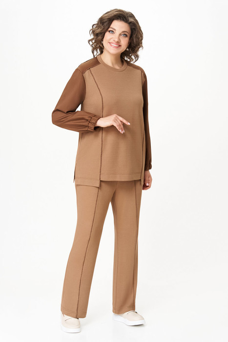 Справа по переду юбки проходит рельеф переходящий в шлицу, ближе к боковым швам расположены листочки, имитирующие карманы. Центр переда юбки украшают декоративные пуговицы.