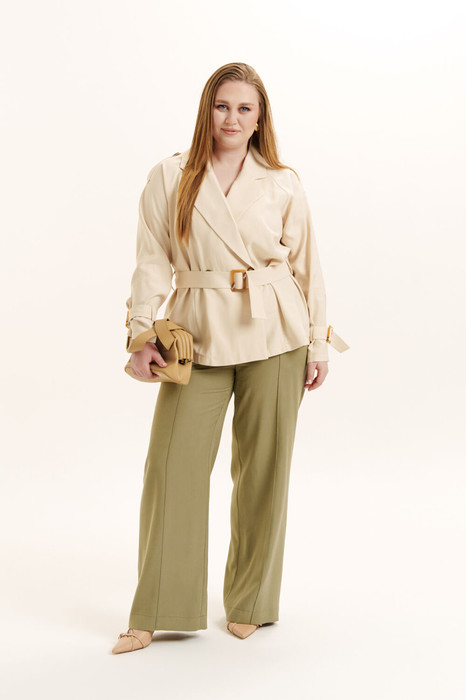 Комплект женский двухпредметный, без подкладки. Жакет прямого силуэта с отлетной кокеткой по спинке и двубортной застежкой .Воротник пиджачного типа с лацканами и застежкой на петли и пуговицы. Рукав реглан, на плечевых швах обработаны хлястики с застежкой на петлю и пуговицу. По низу рукава пришиты шлевки и обработаны паты с декоративной пряжкой. В изделии есть съемный пояс, застежка на декоративную пряжку. Брюки - прямые. По переду и спинке брюк отделочная строчка по стрелкам. Пояс - отрезной с застежкой на молнию и петлю с пуговицей и частично на резинке. В боковых швах обработаны карманы. Отделочная фурнитура может меняться.