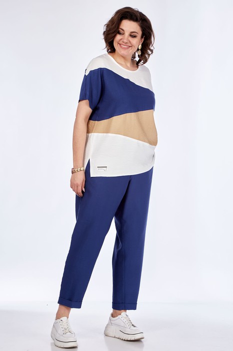 Комплект брючный: блуза+брюки. Блуза выполнена из 4-х цветов ткани. Перед и спинка с тремя волнообразными подрезами. Блуза с цельнокройным рукавом со спущенной линией плеча. В боковых швах обработаны разрезы.Брюки свободные с боковыми карманами в швах,застёжка на тесьму-молнию.Пояс притачной,с эластичной резинкой,со шлевками и завязывающимся мягким поясом.Низ брюк с отложным манжетом.