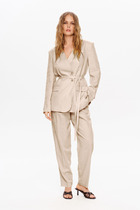 Комплект брючный (кардиган+блузон на бретелях+брюки). Кардиган из отделочной ткани прямого кроя, без застежек. Рукав втачной, одношовный. Рейки по бортам и манжеты выполнены из трикотажного довяза. Блузон на широких бретелях из основной ткани. Перед с нагрудными вытачками, спинка со средним швом, по бокам выполнены разрезы. Брюки из основной ткани, зауженные к низу. Передние половинки с застежкой-молния, задние с талиевыми вытачками. По низу спереди отложной манжет, сзади подгибка ниже передней. Пояс частично на резинке. В большом размере горловина и проймы на обтачках.