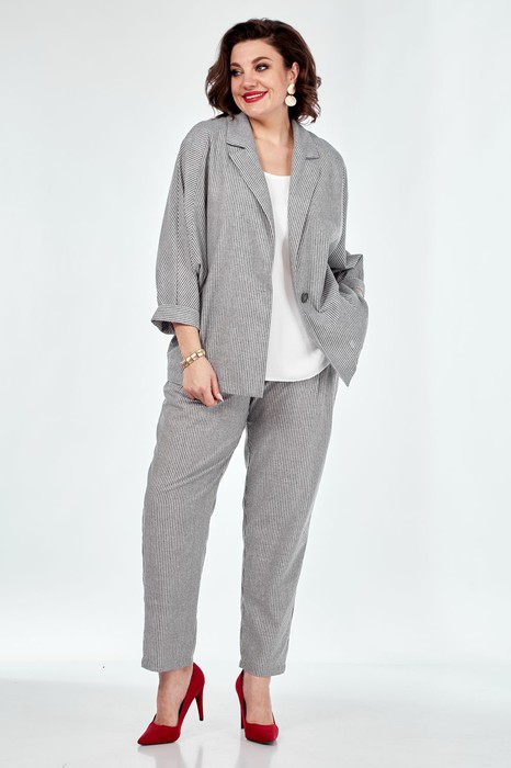 Комплект брючный состоит из жакета, блузы и брюк. Жакет свободного кроя с застежкой на 1 петлю и пуговицу. Перед с боковыми карманами и с листочкой. Воротник пиджачного типа с лацканами. Рукава-реглан длиной 3/4. Спинка украшена нашивкой. Блуза с округлой формой горловины. Перед с нагрудными вытачками. По бокам разрезы. Брюки зауженные к низу. Задние половинки брюк с вытачками и 2-мя складками. Застежка "молния" обработана спереди. Пояс притачной сзади на резинке.
