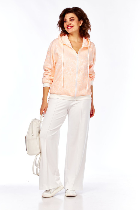Комплект брючный состоит из кофты и брюк. Кофта прямого силуэта с рукавом реглан, с центральной застежкой на тесьму-молнию. По переду накладные карманы. Капюшон с кулисой и шнуром. По низу изделия и рукава манжеты из отделочной ткани. Брюки широкие, верхний срез обработан поясом с резинкой, по передней половине застрочены стрелки.