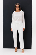 Комплект женский состоит из жакета и брюк. Жакет свободного кроя с застежкоц на 2 петли и пуговицы. Перед с боковыми карманами "с листочкой". Рукав втачной, 2-шовный со спущенной линией плеча, спинка по низу чатсично на резинке. Воротник отложной с лацканами. Брюки широкие. Передние половинки брюк со складками внахлест, с боковыми карманами. Застежка спереди на молнию, передние половинки брюк с вытачками. Пояс по спинке на резинке.
