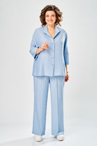 Комплект брючный состоит из рубашки и брюк. Рубашка свободного кроя со спущенной линией плеча, с центральной застежкой на петли и пуговицы. Рукав уельнокроенный, воротник стойка, по переду карманы с листочкой. Брюки широкие, в боковых швах обработаны карманы.