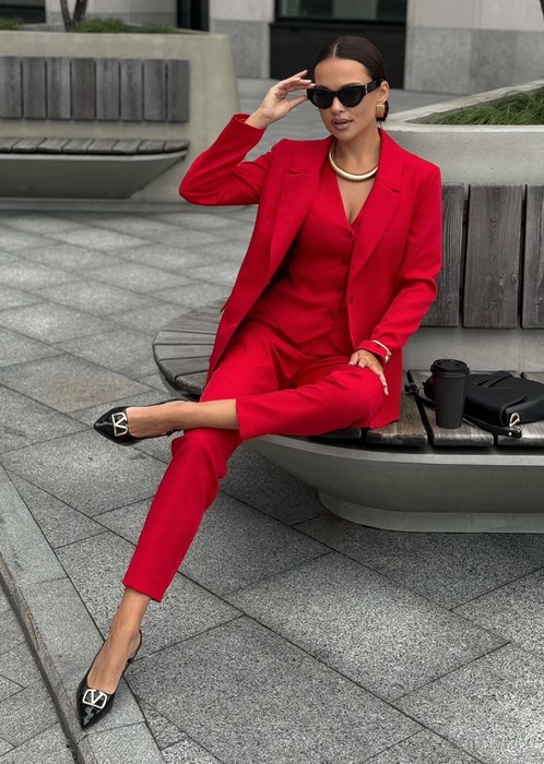 Жакет полуприлегающего силуэта, длиной ниже линии бедер. Спинка с вертикальными рельефами. Перед с центрально-бортовой застежкой на 2 петли-пуговицы и воротником пиджачного типа, вертикальными рельефами, доходящими до линии кармана в рамку с клапаном. Рукава втачные двухшовные. Жакет на подкладке.