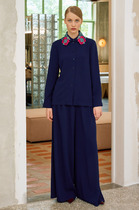 Вырез горловины округлой формы. Рукава втачные, двух шовные. Жакет на подкладке. Брюки полуприлегающие, расширенные к низу, на притачном поясе со шлевками. ЗП брюк с таллиевыми вытачками. ПП брюк с таллиевыми вытачками и карманами с притачной листочкой, выходящим из вытачки. Брюки с поясом в комплекте.