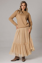Костюм женский из однотонной ткани платьево-блузочного ассортимента. Блузка прямого силуэта сзастежкой на пробивные кнопки, и сформированными завязками по низу. Вортник с притачной стойкой. Рукав втачной с цельнокроенными отложными манжетами. Юбка широкая прямая с притачным поясом с эластичной тесьмой внутри. По верхнему срезу юбки заложены складки. В боковых швах обработаны карманы.