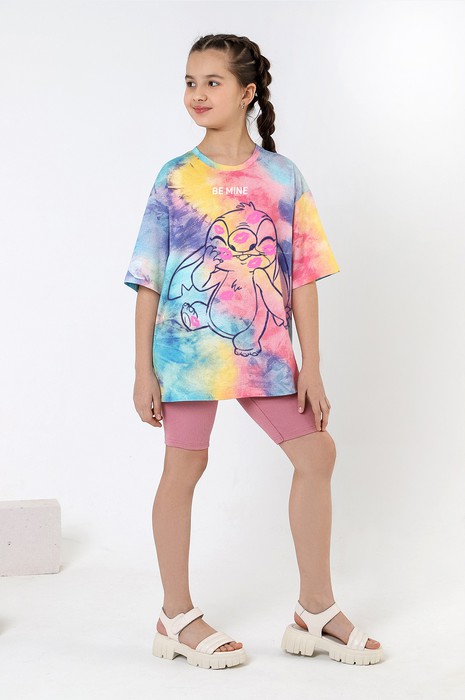 Модный и комфортный костюм для девочки. Футболка из гладкокрашеного трикотажного полотна "кулирка", свободная, удлиненная, со спущенной линией плеч и с ярким принтом на полочке. Бриджи - велосипедки из полотна "кашкорсе", плотно прилегающие к телу, длиной выше колен