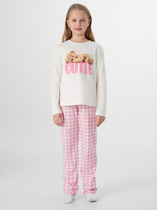 Костюм для девочки из трикотажного полотна "кулирка" в комбинации двух видов: гладкокрашеного и набивного с тематическим рисунком, состоящий из футболки и брюк. Футболка из гладкокрашеного полотна, свободного силуэта, со спущенной линией плеч и втачными короткими рукавами, горловиной овальной формы, обработанной втачной планкой и отделочной строчкой. В центре переда - принт, выполненгный в технике шелкографии. Брюки из полотна с набивным рисунком длинные, прямые, на притачном поясе с эластичной тесьмой внутри и карманами в боковыых швах.
