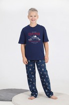 Костюм для мальчика, состоящий из футболки и шорт. Футболка - свободного покроя, короткими втачными рукавами и горловиной овальной формы, обработанной втачной планкой. По шву втачивания планки настрочена двойная отделочная строчка. Шорты - удлиненные, с карманами в боковых швах, на притачном поясе с эластичной тесьмой внутри.