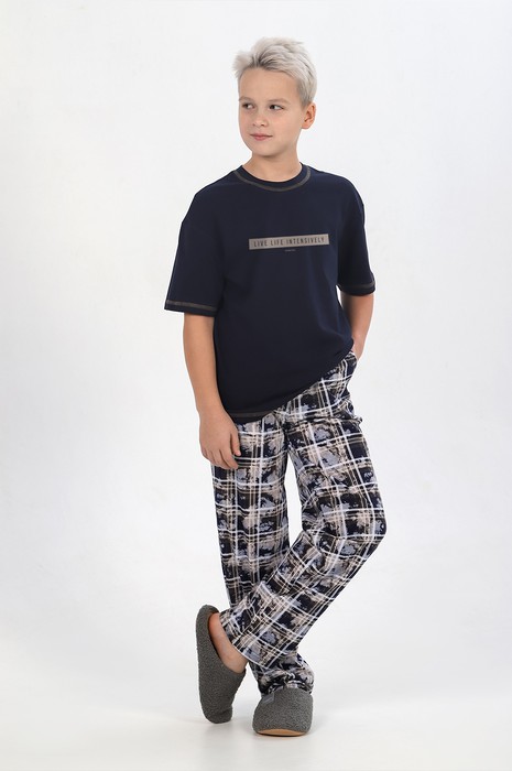 Костюм для мальчика, состоящий из футболки и брюк.Футболка - из гладкокрашеного полотна с принтом на детали переда, классического покроя, с короткими втачнвыми рукавами, удлиненными плечевыми швами и горловиной овальной формы, обработанной втачной планкой. По шву втачивания планки в горловину, подогнутому низу рукавов и подогнутому низу изделия настрочены декоративные отделочные строчки с застилом на лицевой стороне нитками контрастного цвета. Брюки - из полотна с набивным рисунком, длинные, на притачном поясе с эластичной тесьмой внутри и карманами в боковых швах с окантованными срезами Нижние срезы обработаны швом вподгибку.