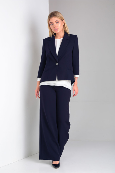 Элегантный брючный костюм в комплекте с шифоновой блузкой.Жакет полуприлегающего силуэта с воротником и лацканами классической формы, застежкой на 1 пуговицу. Особое внимание заслуживает экстравагантная спинка с имитацией запаха и серебристыми металлическими акцентами в виде цепочек, соединяющих две половинки отлетной спинки.Брюки прямого покроя расширены от линии бедра. Комфортная посадка брюк и подчеркивающий фигуру крой сделает их любимым предметом вашего гардероба.Костюм выполнен из материала модных цветов, не требующего особого ухода, пластичен и удобен в носке.Блузка-туника нежного молочного пастельного оттенка с шифоновыми рукавами. Блуза очаровывает своим красивым непринужденным полуприлегающим силуэтом, фигурной линией низа, и конечно же спинкой.Фантазийная спинка с шифоновыми вставками и воланами, красиво драпирующимися и являющимися одним из популярных трендов, шикарно смотрится как самостоятельно, так и в сочетании с эффектным разрезом на жакете.