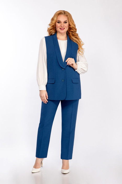 Комплект тройка состоит из блузки, жилета и брюк. Жилет полуприлегающего силуэта. Центральная застежка на 2, пуговицы. Воротник шалевый. На полочке прорезные карманы с клапаном. Полочка обработана подкладкой. Спинка с рельефными швами. Блуза прямого силуэта из креп-шифона. На полочке нагрудные вытачки, по центру полочки декоративный элемент. Горловина обработана притачной планкой. Спинка со средним швом. Застежка в среднем шве спинке на 1 навесную петлю, 1 пуговицу. Рукав втачной. Низ рукава присборен, обработан манжетой. В боковых швах разрезы. Брюки слегка заужены к низу. Пояс притачной частично на резинке. Застежка на тесьму молнию и петлю пуговицу.