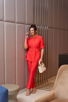 Идеальное решение на летний период, 2-х предметный комплект, состоящий из блузы и брюк. Легкая, струящаяся ткань, не стесняет движение и сохраняет привлекательный, женственный образ. Женственная блуза, которая создает эффектный и стильный образ. Изделие полуприлегающего силуэта, талия фиксируется поясом из основной ткани. Воротник рубашечный. V-образный вырез горловины. Рукав втачной, низ обработан притачной манжетой. В боковых швах имеются разрезы, Брюки прямые, с функциональными боковыми карманами, пояс притачной на резинке в круговую