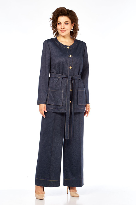 Брючный 2-х предметный комплект состоящий из жакета и брюк свободного силуэта. Выполнен из трикотажного полотна в стиле джинс, выполнении из трикотажного полотна. Мягкая и очень комфортная ткань, не стесняет движение и сохраняет привлекательный, женственный образ. Жакет без подкладки, застежка по центру в виде планки на петли и контрастные пуговицы, что является акцентом данного образа. Полочка с накладными карманами Горловина скругленной формы на обтачке. Рукав втачной. В боковых швах скругленные разрезы. Жакет отлично смотрится в расстёгнутом виде, хорошим дополнением будет являться топ, так образ станет еще эффектнее. Брюки полной длины, свободного прямого кроя с функциональными боковыми карманами, пояс притачной на резинке вкруговую. В комплекте прилагается съемный пояс из основной ткани.